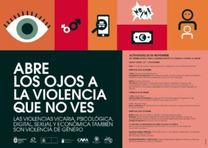 Este año además se ha activado la campaña “Abre tus ojos a la violencia que no ves” que pretende visibilizar las diferentes violencias que se ejercen contra la mujer: vicaria, psicológica, digital, sexual económica, además de la propia violencia de género.