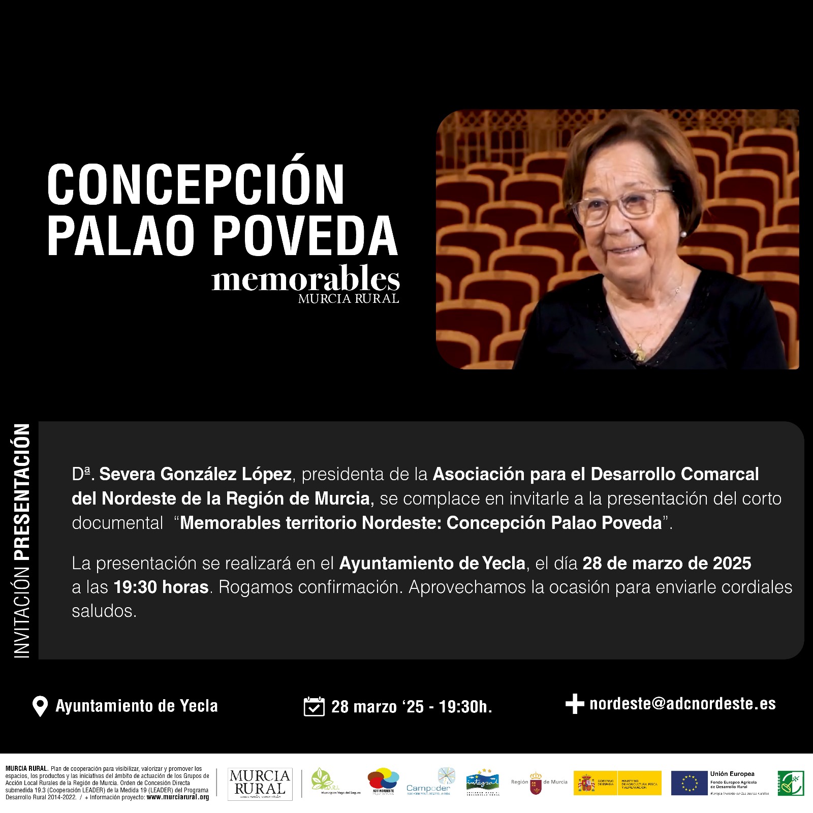 El 28 de marzo se estrena el primer corto documental del proyecto MURCIA RURAL, donde Concha Palao Poveda es la memorable protagonista. La serie documental Memorables del proyecto de cooperación MURCIA RURAL aborda la historia de vida de personas que se han considerado dignas de memoria.