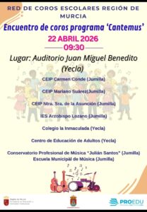 Encuentro de Coros Escolares «Cantemus» + Añadir Google Calendar + exportación iCal / Outlook Fecha 22 Abr 2026 Hora 8:00 Localización Auditorio Municipal "Juan Miguel Benedito" Plaza Mayor, s/n - 30510 Yecla (Murcia)