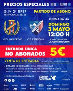 PARTIDO DE ABONO – YECLANO VS ESTEPONA + Añadir Google Calendar + exportación iCal / Outlook Fecha 03 May 2026 Hora 12:00 Localización Campo de Fútbol La Constitución Calle Cruz de Piedra, 146, 30510 Yecla, Murcia