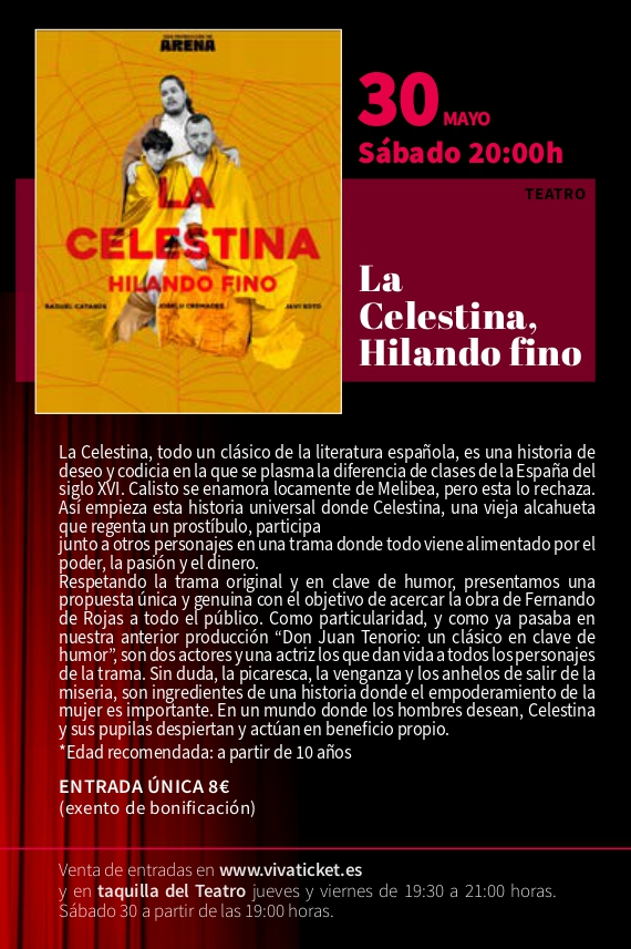 Teatro: La Celestina, hilando fino TEATRO CONCHA SEGURA – SÁBADO 30 DE MAYO – 20 H Entradas disponibles en taquilla y en Vivaticket + Añadir Google Calendar + exportación iCal / Outlook Fecha 30 May 2026 Hora 20:00 Localización Teatro Concha Segura Parque de la Constitución, s/n. 30510 Yecla (Murcia) Categoría Actos Teatro Concha Segura