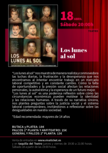 Teatro: Los Lunes al Sol TEATRO CONCHA SEGURA – SÁBADO 18 DE ABRIL – 20 H Entradas disponibles en taquilla y en Vivaticket + Añadir Google Calendar + exportación iCal / Outlook Fecha 18 Abr 2026 Hora 20:00 Localización Teatro Concha Segura Parque de la Constitución, s/n. 30510 Yecla (Murcia) Categoría Actos Teatro Concha Segura