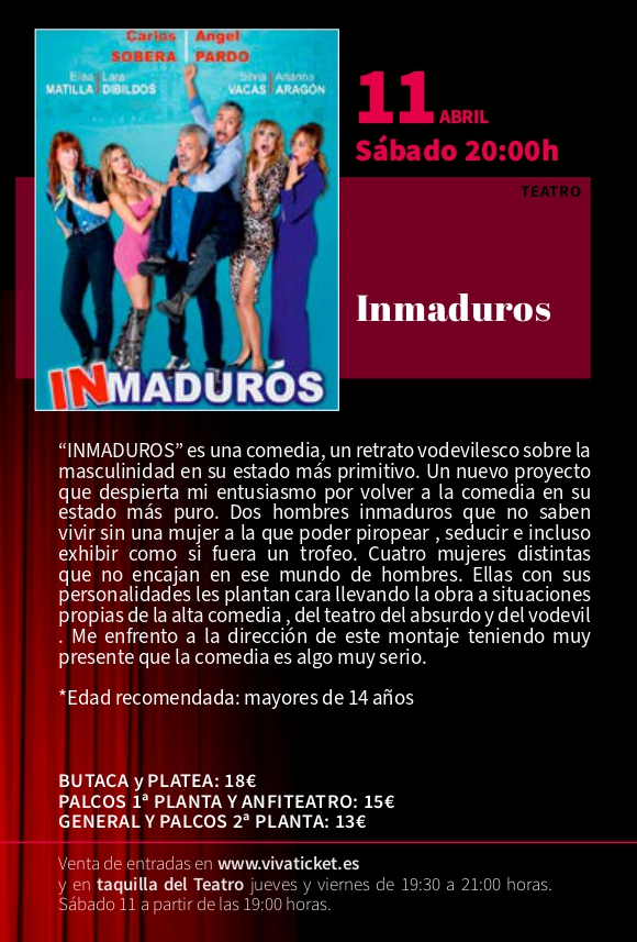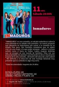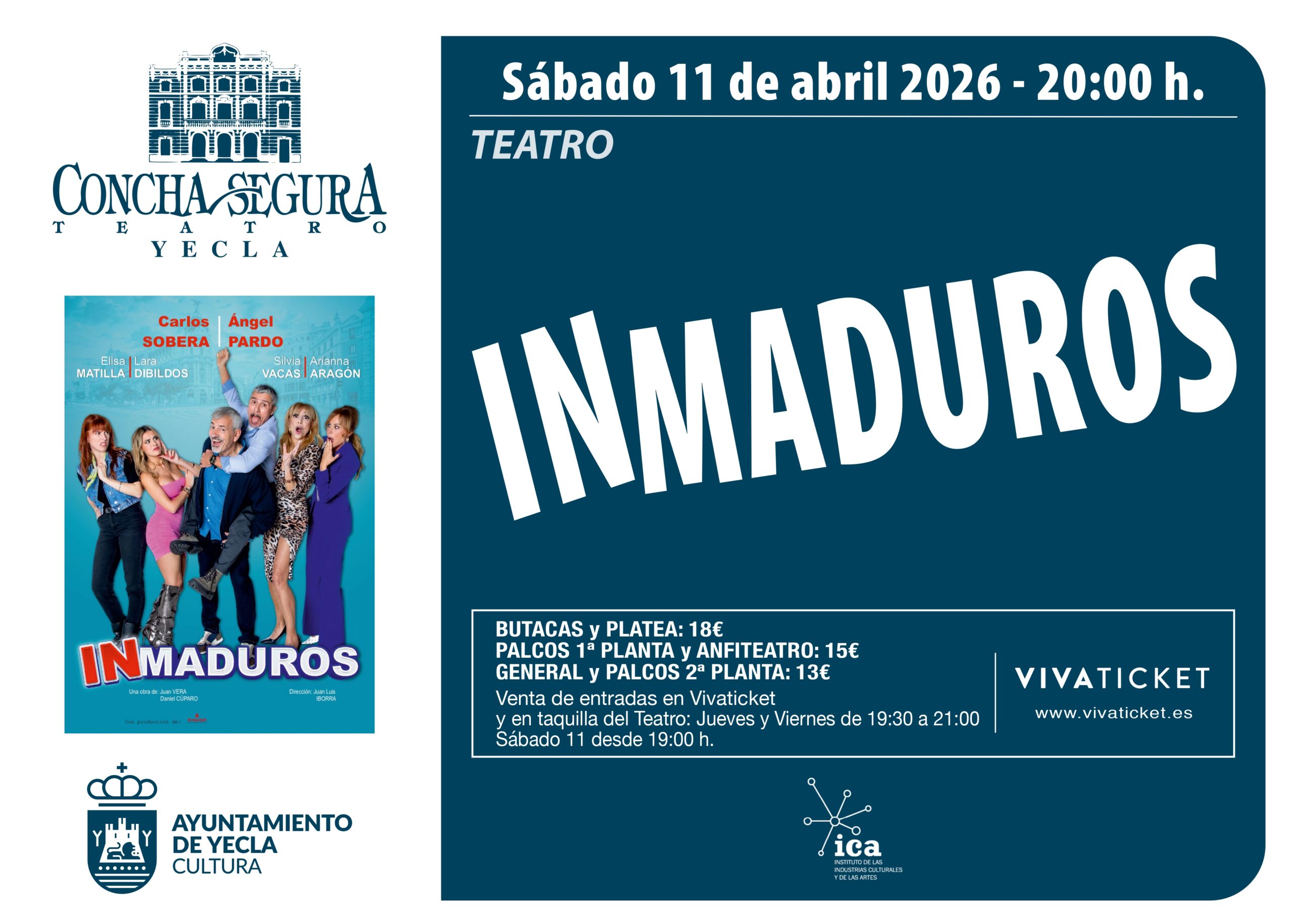Teatro: Inmaduros TEATRO CONCHA SEGURA – SÁBADO 11 DE ABRIL – 20 H Entradas disponibles en taquilla y en Vivaticket + Añadir Google Calendar + exportación iCal / Outlook Fecha 11 Abr 2026 Hora 20:00 Localización Teatro Concha Segura Parque de la Constitución, s/n. 30510 Yecla (Murcia) Categoría Actos Teatro Concha Segura