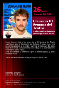 Clausura III Semana del Teatro: A solas con Ricardo Gómez y monologo de Bianka Kovacs