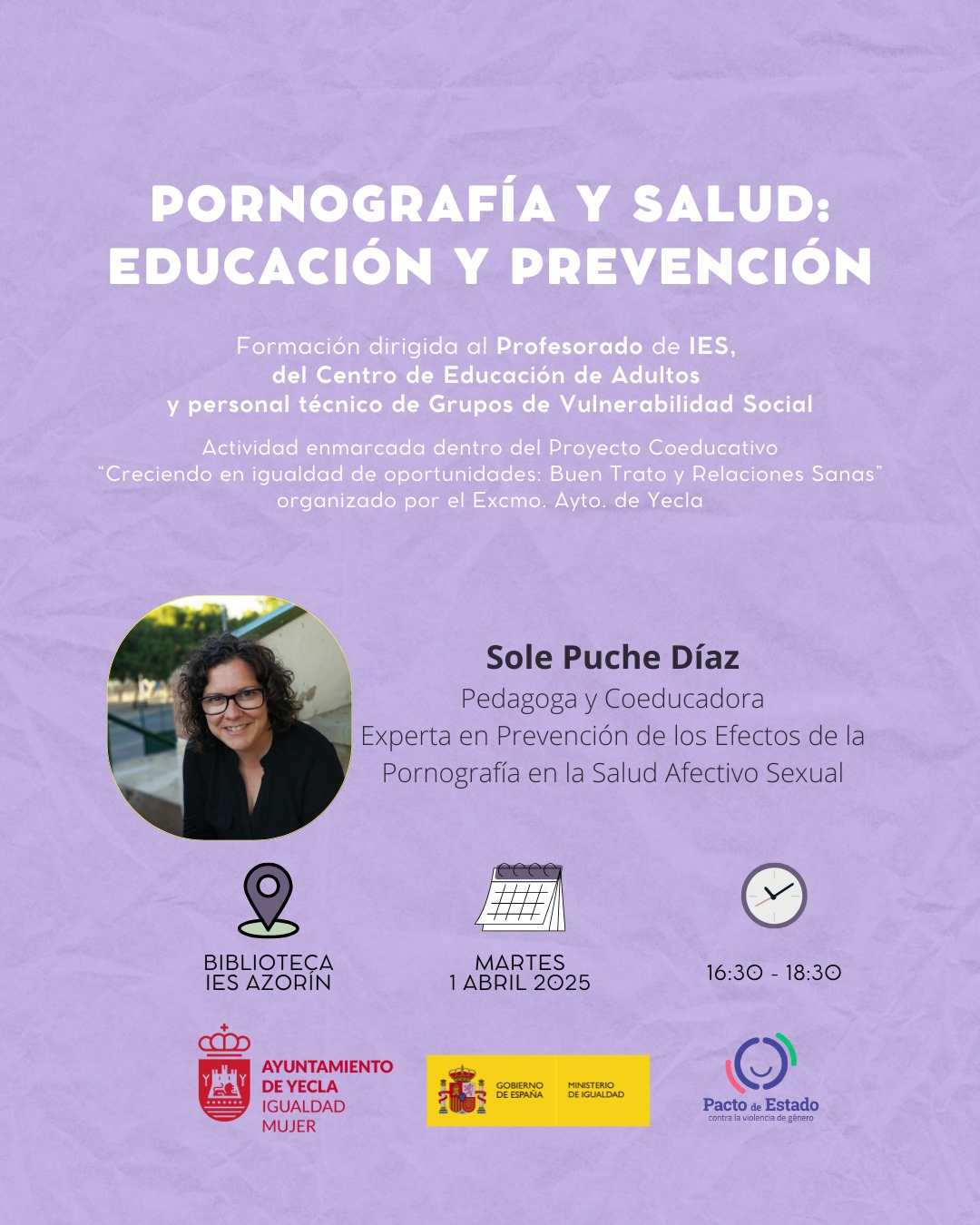 A cargo de Sole Puche Díaz – Pedagoga y coeducadora. Experta en Prevención de los Efectos de la Pornografía en la Salud Afectivo Sexual.