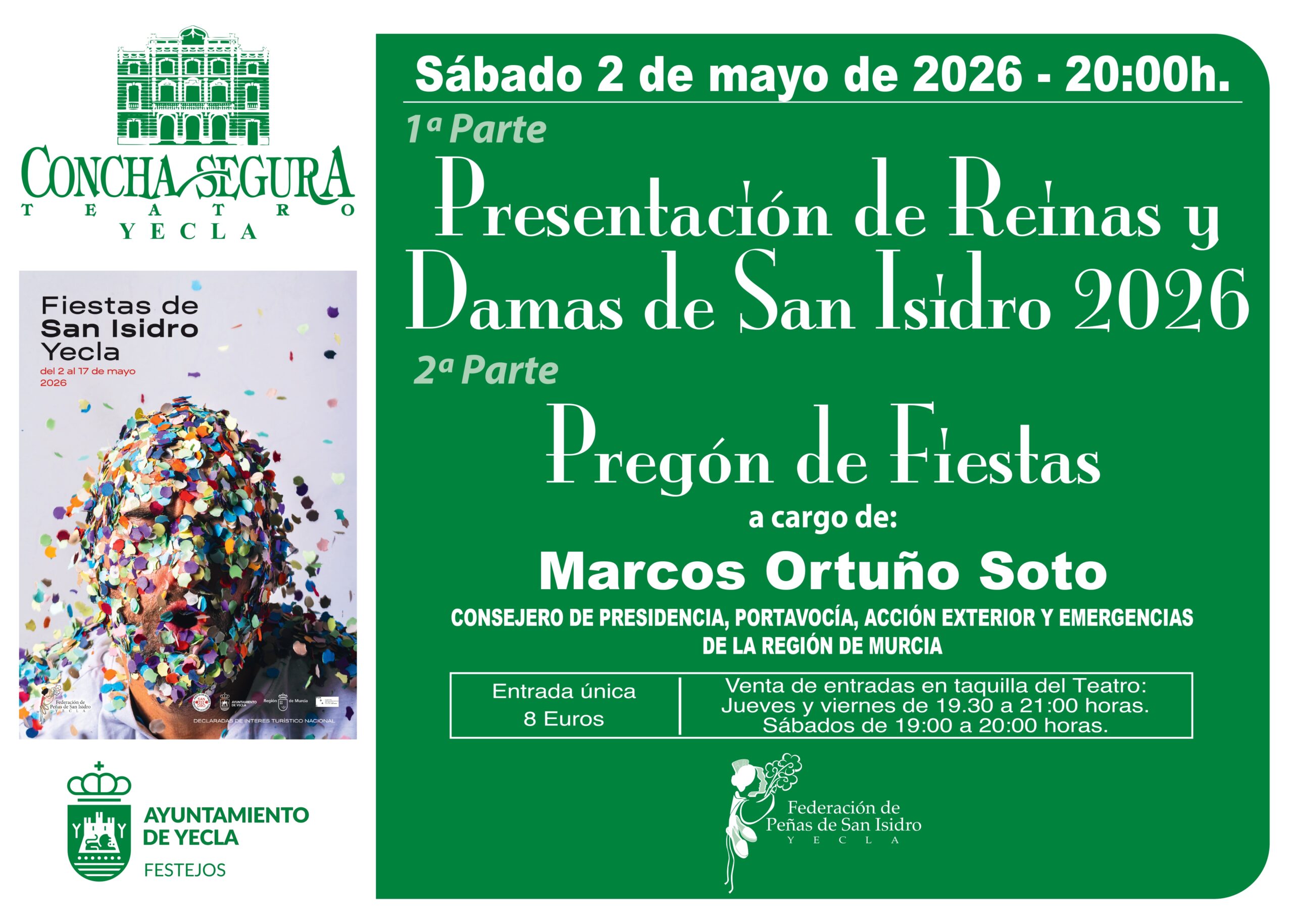 PREGÓN DE FIESTAS DE SAN ISIDRO 2026 SÁBADO 2 DE MAYO – 20H Teatro Concha Segura. Entradas disponibles a partir de la tarde del jueves 23 de abril, de 19h30 a 21h y sábado 2 mayo de 19h a 20h. . + Añadir Google Calendar + exportación iCal / Outlook Fecha 02 May 2026 Hora 20:00 Localización Teatro Concha Segura Parque de la Constitución, s/n. 30510 Yecla (Murcia) Categoría Actos Fiestas de San Isidro