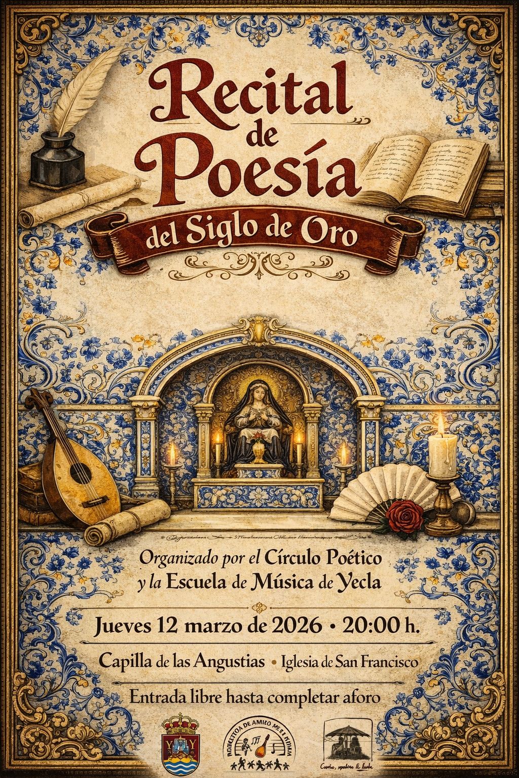 Recital de Poesía del Siglo de Oro Organizado por el Círculo Poético y la Escuela de Música de Yecla + Añadir Google Calendar + exportación iCal / Outlook Fecha 12 Mar 2026 Localización Iglesia de San Francisco Camino Real, 1 Categoría Actos Escuela de Música