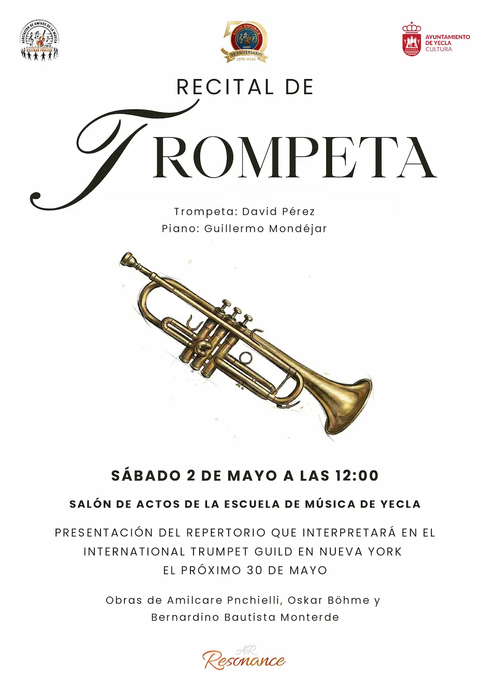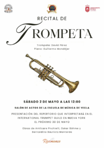 Recital de Trompeta Sábado 2 de Mayo – 12h Salón de actos Escuela de Música . + Añadir Google Calendar + exportación iCal / Outlook Fecha 02 May 2026 Hora 12:00 Localización Sala de Audiciones de la Escuela de Música Calle España, 12