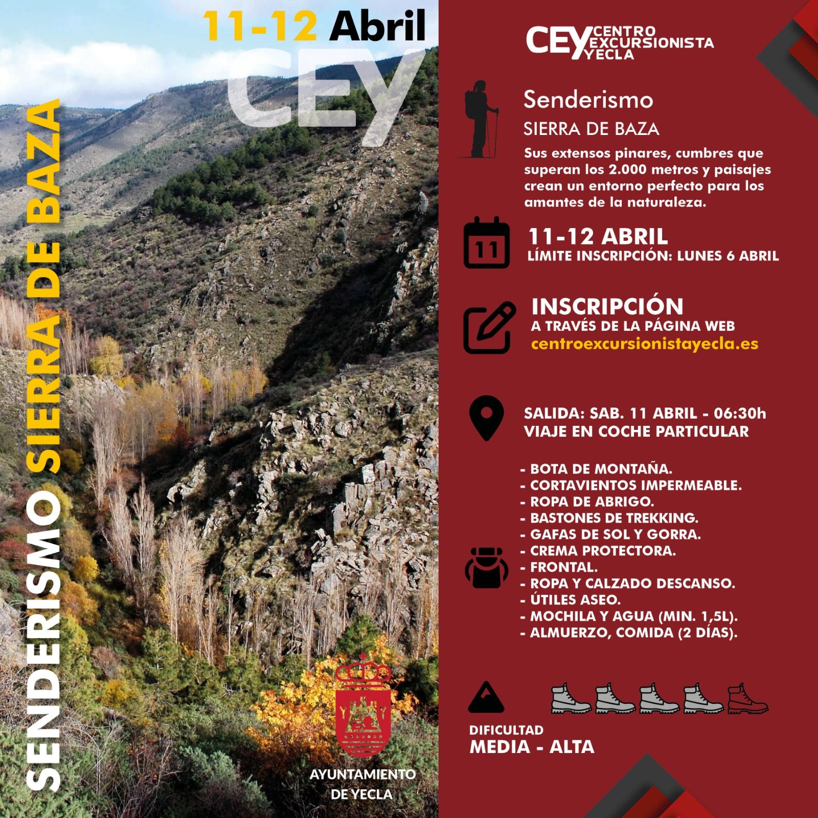 Actividad CEY: Senderismo Sierra de Baza CEY – 11-12 ABRIL SENDERISMO SIERRA DE BAZA Inscripción: Lunes 6 de abril . Ayuntamiento de Yecla + Añadir Google Calendar + exportación iCal / Outlook Fecha 11 - 12 Abr 2026 Categoría Centro Excursionista Yecla