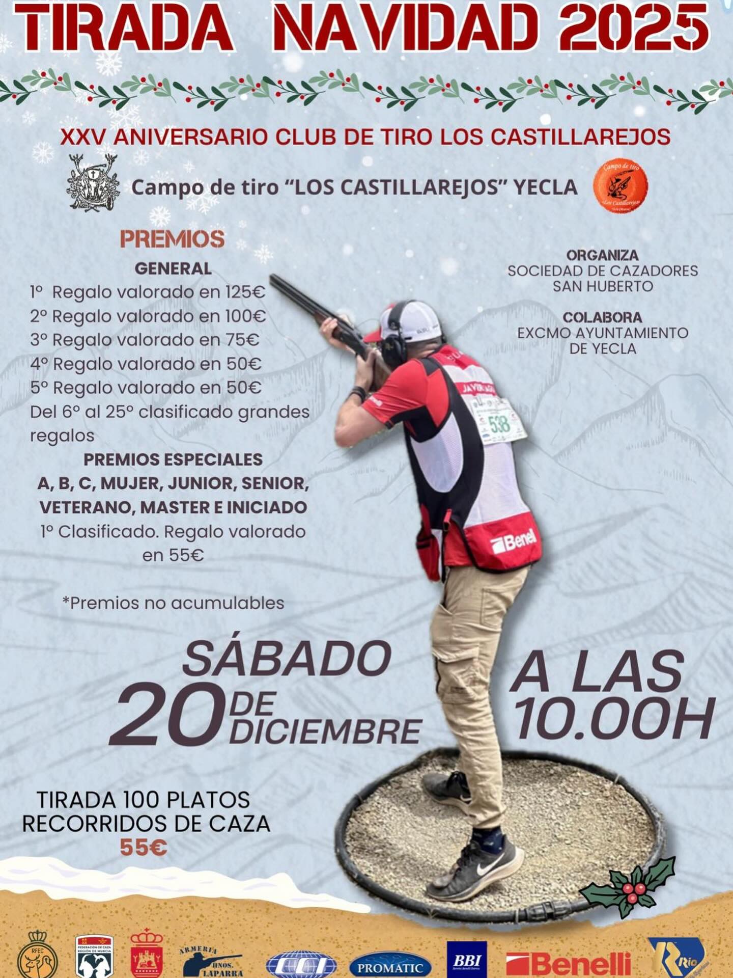 Tirada Navidad 2025 Sábado 20 de diciembre 2025 a las 10h Ubicación: Campo de tiro «Los Castillarejos». . + Añadir Google Calendar + exportación iCal / Outlook Fecha 20 Dic 2025 Hora 10:00 Categoría Deportes