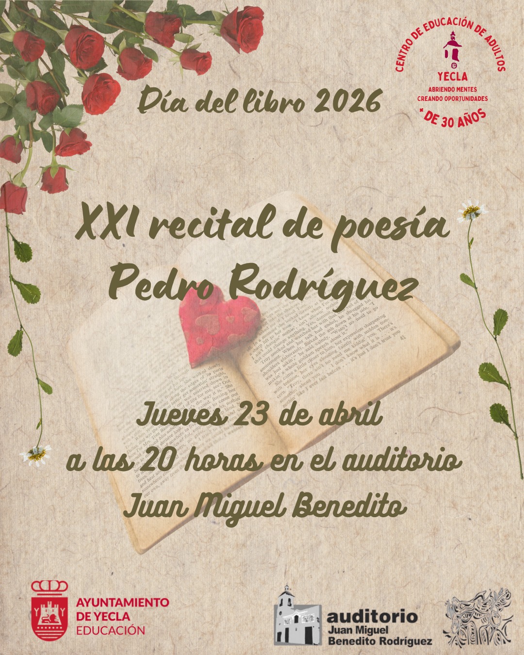 XXI Recital de poesía CEA XXI Recital de poesía CEA – Día del Libro 2026 Pedro Rodríguez Jueves 23 de abril 20h Auditorio municipal Miguel Benedito . + Añadir Google Calendar + exportación iCal / Outlook Fecha 23 Abr 2026 Hora 20:00 Localización Auditorio Municipal "Juan Miguel Benedito" Plaza Mayor, s/n - 30510 Yecla (Murcia) Categoría Actos Día Internacional del Libro