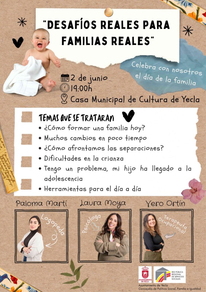 La charla taller con el título “Desafíos reales para familias reales” estará impartida por tres mujeres profesionales: Vero Ortín, terapeuta ocupacional; Laura Moya, psicóloga; y Paloma Martí, logopeda. Tendrá lugar el lunes 2 de junio a las 19:00 horas en el salón de actos “Pablo Corbalán” de la Casa Municipal de Cultura, dirigida a toda la ciudadanía y con entrada libre hasta completar aforo.
