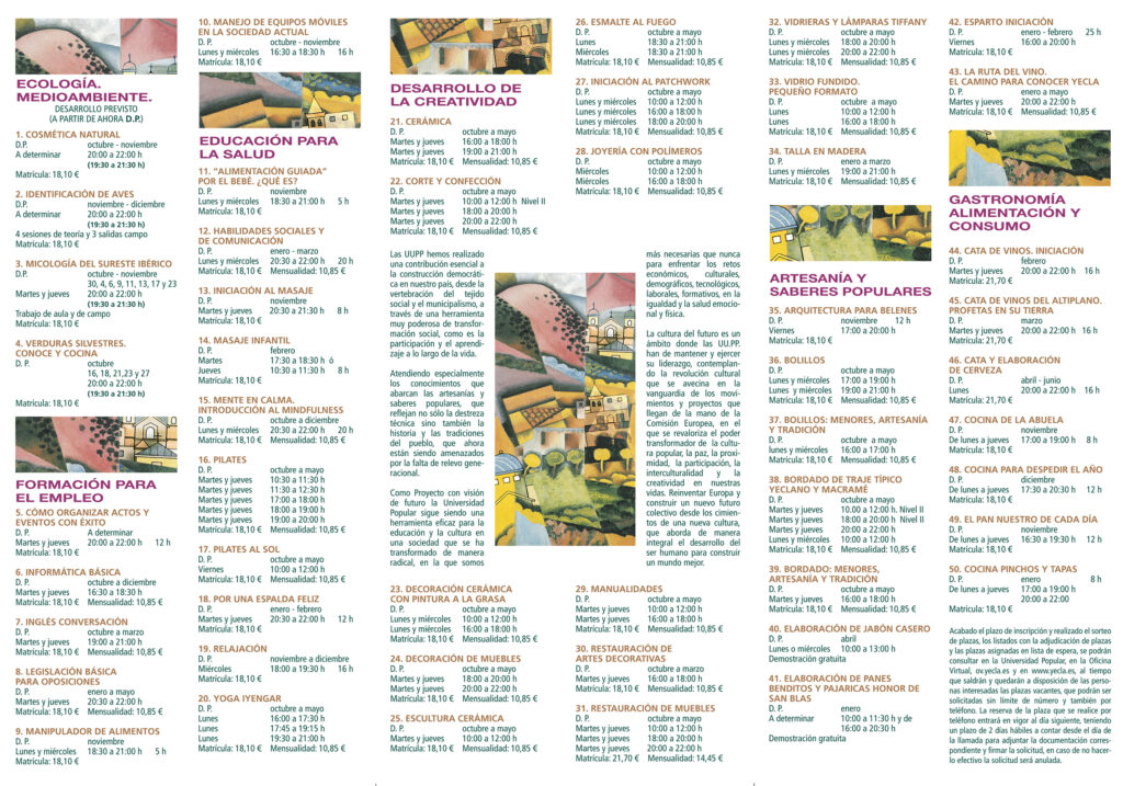 La Universidad Popular, como centro educativo y cultural, ofrece la posibilidad de adquirir formación para el trabajo, renovar conocimientos, cultivar destrezas plásticas, completar y poner en práctica nuestra educación para la salud y la felicidad.