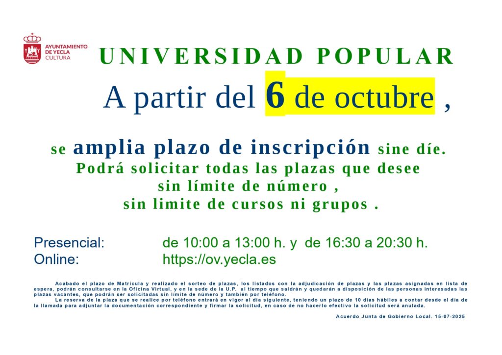 Desde hace 40 años, la Universidad Popular de Yecla tiene como objetivo en su programa y trabaja en favor de “facilitar el acceso de todas las personas a la educación, la formación, al ocio creativo y a los bienes culturales”.