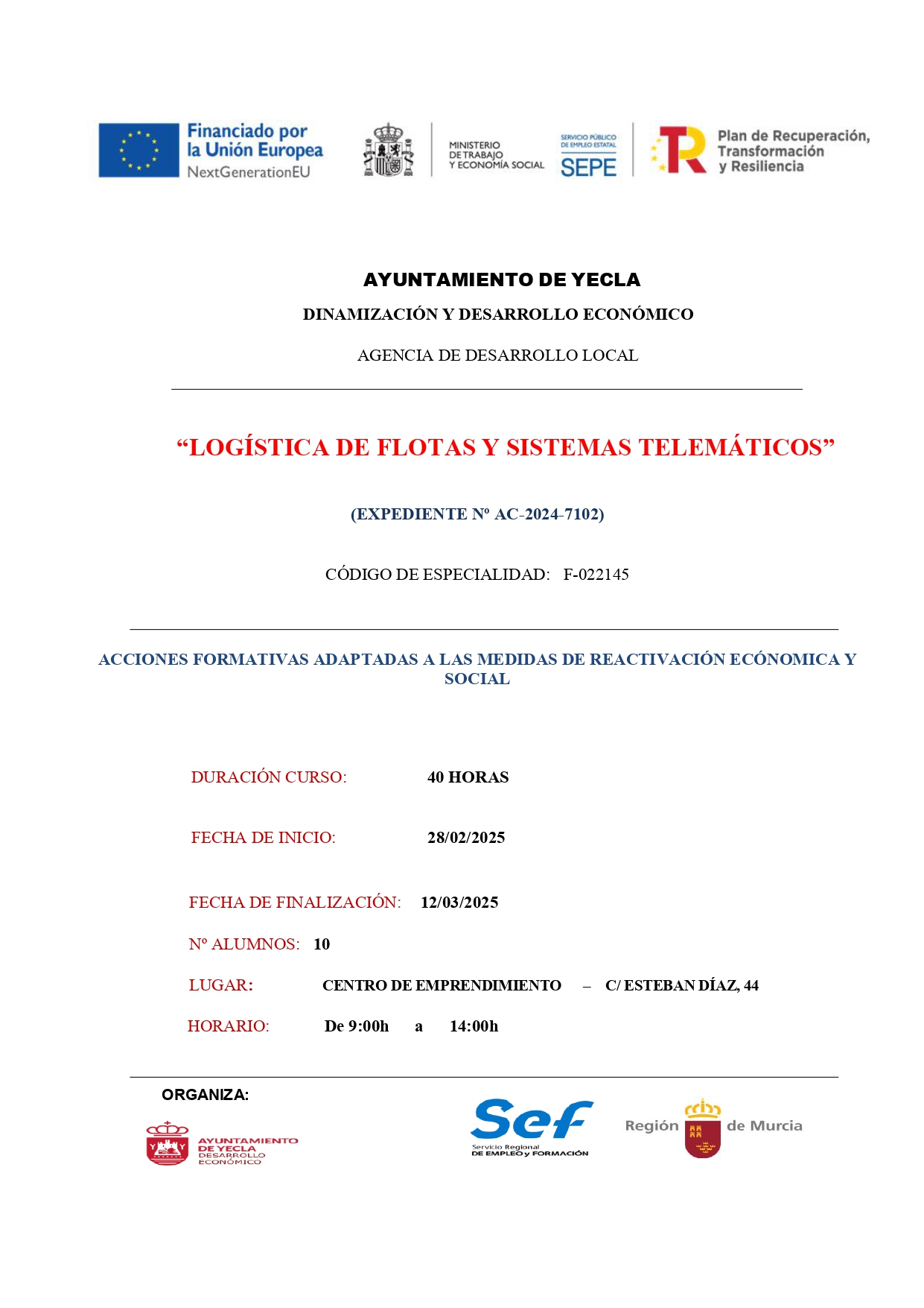 Plazo de inscripción: hasta el próximo 21 de febrero o completar las plazas disponibles.