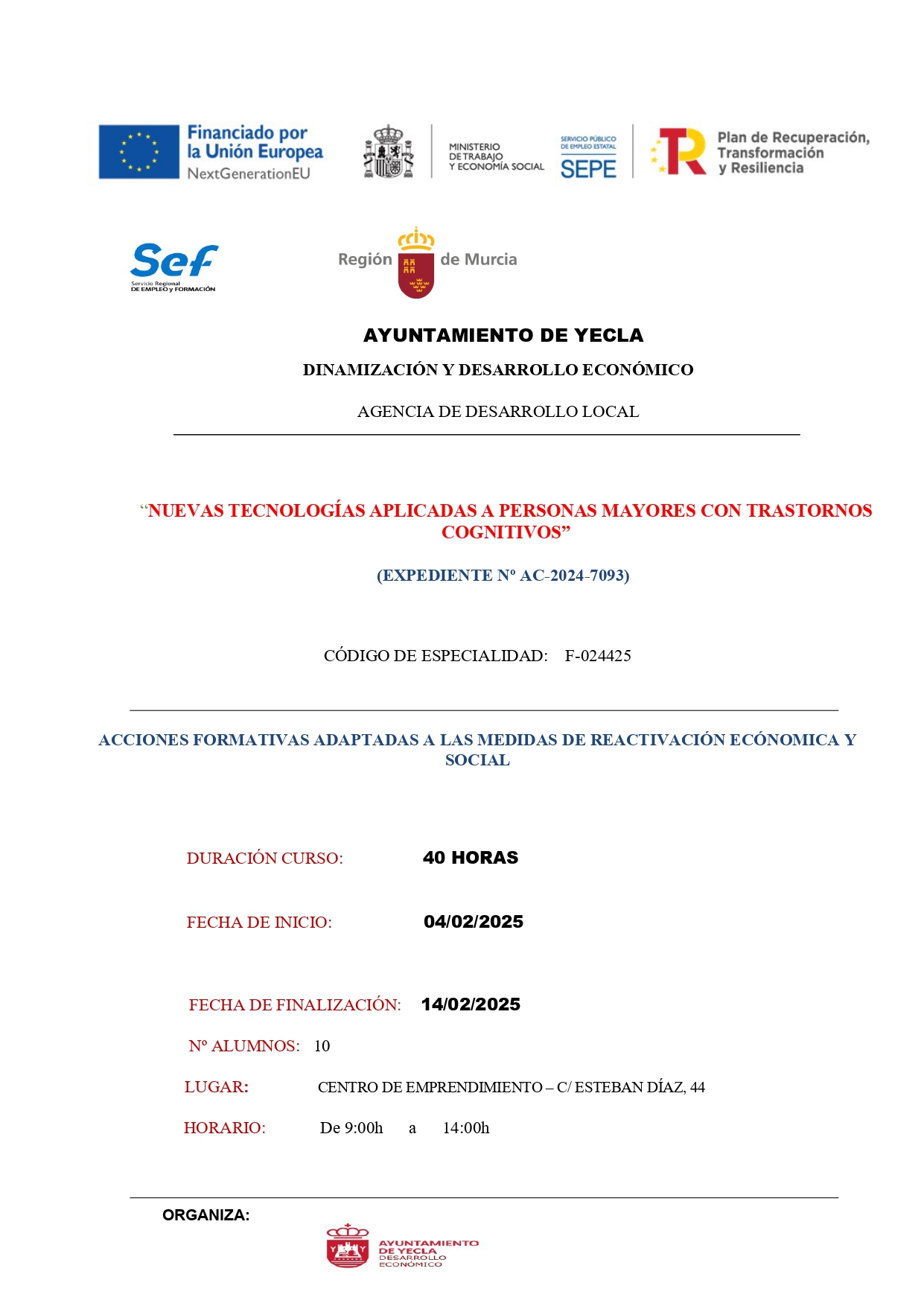 INFORMACIÓN E INSCRIPCIONES: Agencia de Desarrollo Local, 1ª Planta Ayuntamiento. Plaza Mayor, s/n Yecla. Tfno: 968 75 11 35 ext. 1202, 1204.