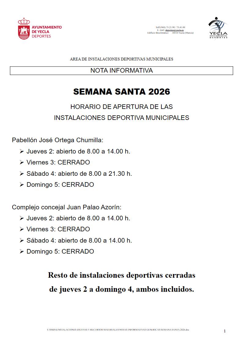 - Polideportivo concejal Juan Palao Azorín: Sábado y Domingo cerrado.