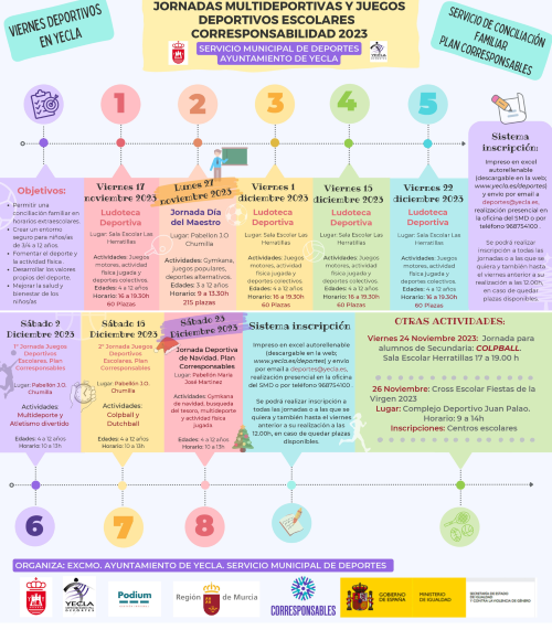 Además, se han programado 3 sábados por la mañana como continuación de los juegos deportivos municipales. Se realizarán actividades complementarias a las actividades de multideporte que se realizan en los colegios. El lunes 27 de noviembre, Día del Maestro, se ha programado una actividad deportiva, por la mañana, en el Pabellón José Ortega Chumilla.