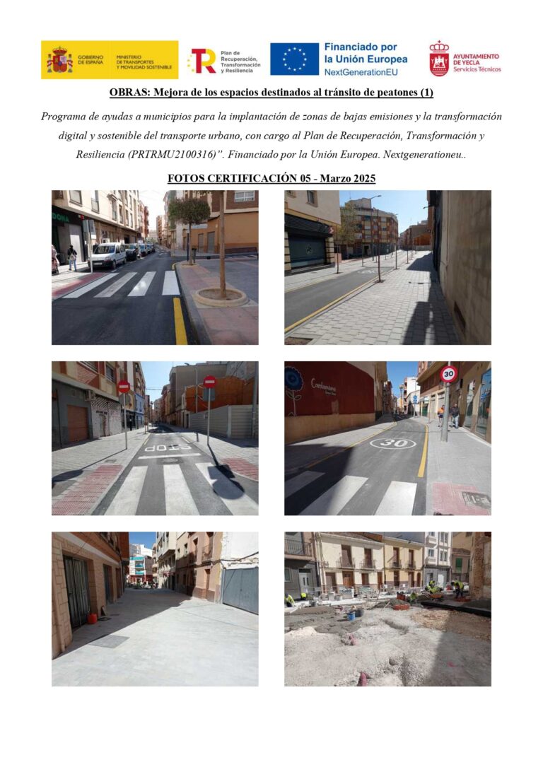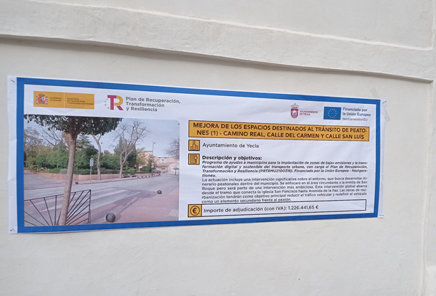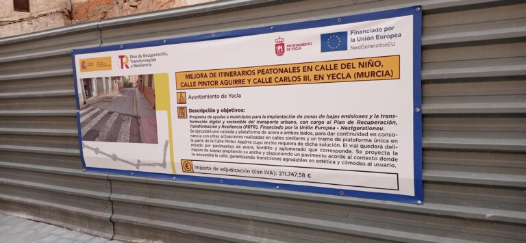 Prioridades de actuación para mejorar la movilidad del peatón en Yecla. Expedientes de contratación: C.SE.12/22 EU: Contrato de Servicios de Asistencia técnica necesaria para la planificación de actuaciones, redacción de proyectos y modelización del sistema de transporte global, incluidas en el Programa de mejora e implantación de las líneas estratégicas de movilidad de Yecla, “Yecla Sostenible 2021-2024”, dentro del “Programa de Ayudas a municipios para la implantación de zonas de bajas emisiones y la transformación digital del transporte urbano” en el marco del Plan de Recuperación Transformación y Resiliencia con cargo a los fondos Next Generation UE, a adjudicar mediante procedimiento abierto simplificado. C.O.2/24: Mejora de itinerarios peatonales en C/ del Niño, C/ Pintor Aguirre y C/ Carlos III, en Yecla. Programa de ayudas a municipios para la implantación de zonas de bajas emisiones y la trnasformación digital y sostenible el transporte urbano, con cargo al plan de recuperación, transformación y resiliencia (PRTR). C.O.8/24: Mejora de los espacios destinados al tránsito de peatones. Programa de ayudas a municipios para la implantación de zonas de bajas emisiones y la transformación digital y sostenible el transporte urbano, con cargo al plan de recuperación, transformación y resiliencia PRTRMU2100316)”. Financiado por la Unión Europea. Next Generation EU. |