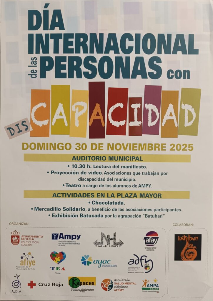 La concejal de Política Social, Patricia Soriano ha destacado que “estas actividades se realizan con motivo del día Internacional de las personas con Discapacidad, que es el 3 de diciembre con el fin de visibilizar y sensibilizar las necesidades y derechos del colectivo de estas personas. Actividades emotivas para un día tan especial”. Asimismo, ha reconocido que el Ayuntamiento de Yecla “alaba a todas estas asociaciones por la labor que realizan y que contribuye a visibilizar y apoyar estos colectivos”.