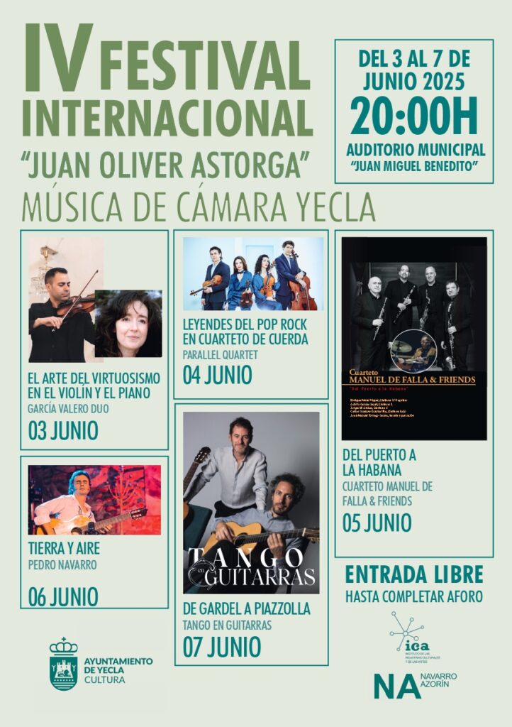 Del 3 al 7 de junio llega la cuarta edición del Festival Internacional de Música de Cámara de Yecla “Juan Oliver Astorga” organizado por la Concejalía de Cultura con la colaboración de la empresa yeclana Navarro Azorín.