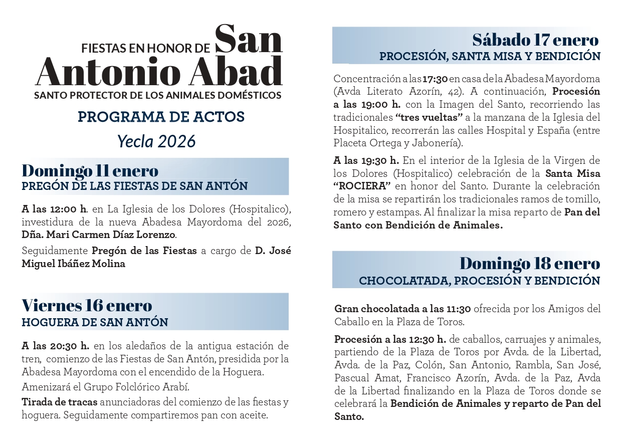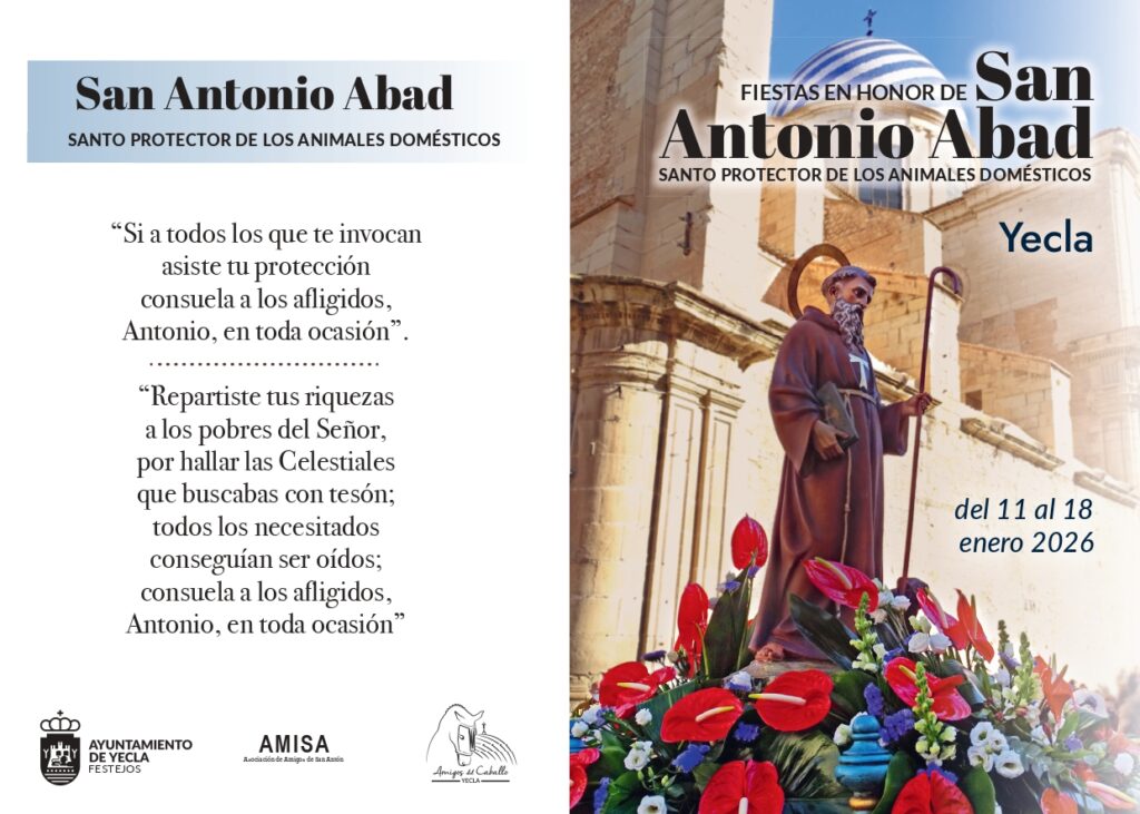 Con motivo de las Fiestas en Honor a San Antonio Abad, Santo protector de los animales domésticos, presentamos el programa oficial de actos del 11 al 18 de enero de 2026.