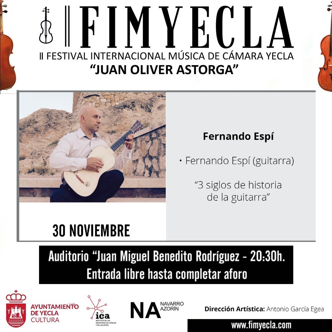 Concierto del guitarrista Fernando Espí: «3 siglos de historia de la guitarra». El concierto tendrá lugar en el Auditorio Municipal “Juan Miguel Benedito Rodríguez”, a las 20:30h.
