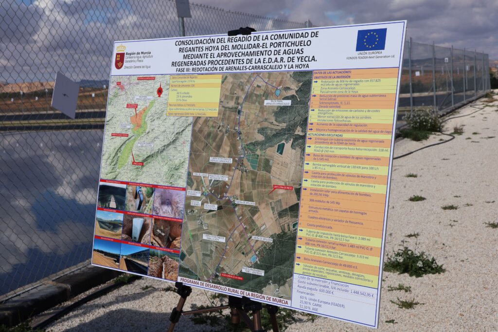 El Gobierno de la Región de Murcia ha destinado más de 1,15 millones de euros a la modernización de infraestructuras de regadío en la Comunidad de Regantes Hoya del Mollidar-Portichuelo, en Yecla, a través de dos líneas de ayudas que han permitido movilizar una inversión total cercana a los 2,85 millones de euros. Asimismo, la consejera recordó que la Región de Murcia es líder en España y Europa en el uso de aguas regeneradas para uso agrícola, y actuaciones como esta demuestran que la modernización del regadío y la apuesta por recursos hídricos no convencionales avanzan de forma paralela para garantizar la sostenibilidad del sector”.