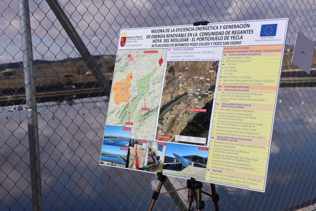 La primera actuación fue para construir balsas de regulación, instalar bombeo con energía solar y ampliar la red de distribución, garantizando que el agua llegue con seguridad a los agricultores. Con la instalación de las nuevas plantas fotovoltaicas en los pozos Valdés y San Isidro, se suman más de 1.000 kilovatios pico, que reducen el coste del bombeo.