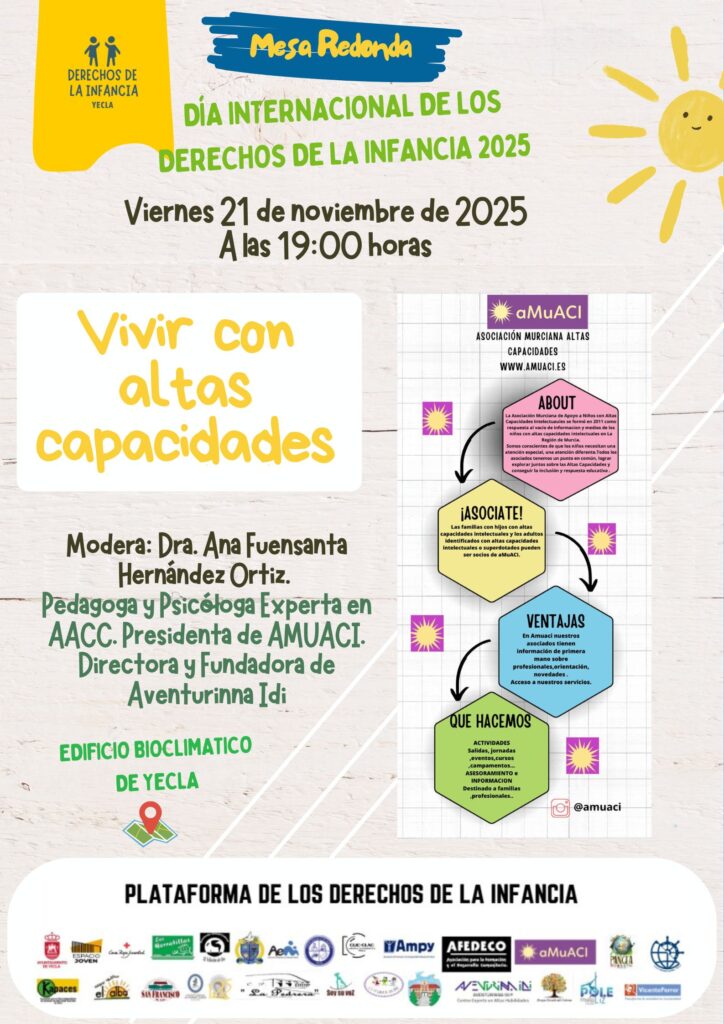 Ya el viernes, 21 de noviembre, a las 19 horas, se realizará una mesa redonda moderada por la doctora Ana Fuensanta Hernández Ortiz. En esta ocasión se hablará decómo es “Vivir con altas capacidades”. Hernández es pedagoga y Psicóloga y experta en Altas Capacidades, además es presidenta de AMUACI y directora y fundadora de Aventurinna Idi.