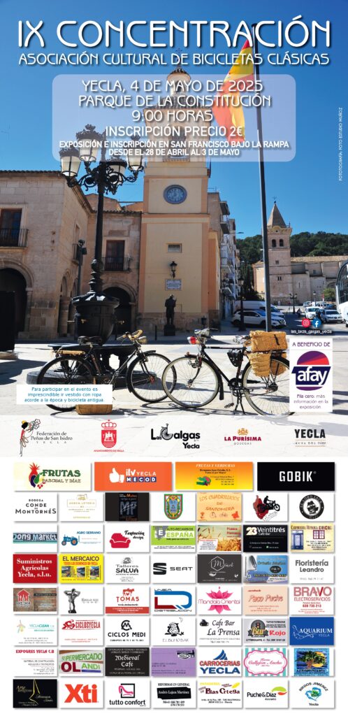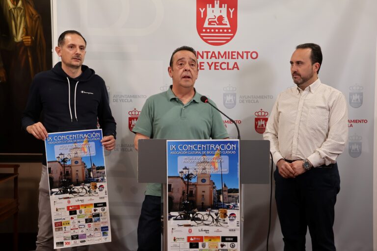 El concejal de Festejos, José Antonio Marín, y el presidente de la asociación de bicicletas clásicas ‘Las Galgas’, Martín Marco, han presentado este miércoles la IX Concentración de Bicicletas Clásicas, todo un clásico ya previo a las Fiestas de San Isidro y que en esta ocasión se celebrará este domingo 4 de mayo, en el Parque de la Constitución, a partir de las 9:00 horas de la mañana. En esta edición, toda la recaudación se va a destinar a beneficio de AFAY, la Asociación de amigos y familiares de enfermos de Alzheimer de Yecla.