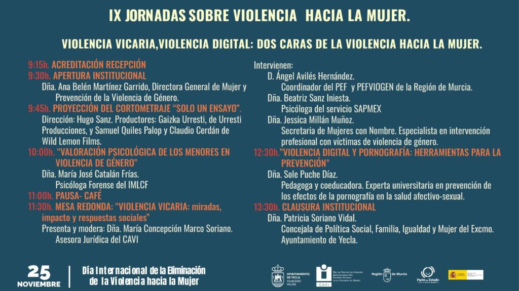La psicóloga forense del IMLCF, María José Catalán Frías, realizará una ponencia en la que hablará de como se realiza la valoración psicológica de los menores en casos de violencia de genero, será en torno a las diez de la mañana. Tras una pausa, se desarrollará la mesa redonda titulada “ Violencia Vicaria: miradas, impacto y respuestas sociales”, presentada y moderada por la asesora jurídica del CAVI, María Concepción Marco Soriano. En ella intervendrán: Ángel Avilés Hernández, coordinador del PEF y PEFVIOGEN de la Región de Murcia; Beatriz Sanz Iniesta, psicóloga del servicio SAPMEX y Jessica Millán Muñoz, secretaria de Mujeres con Nombre y especialista en intervención profesional con víctimas de violencia de género.