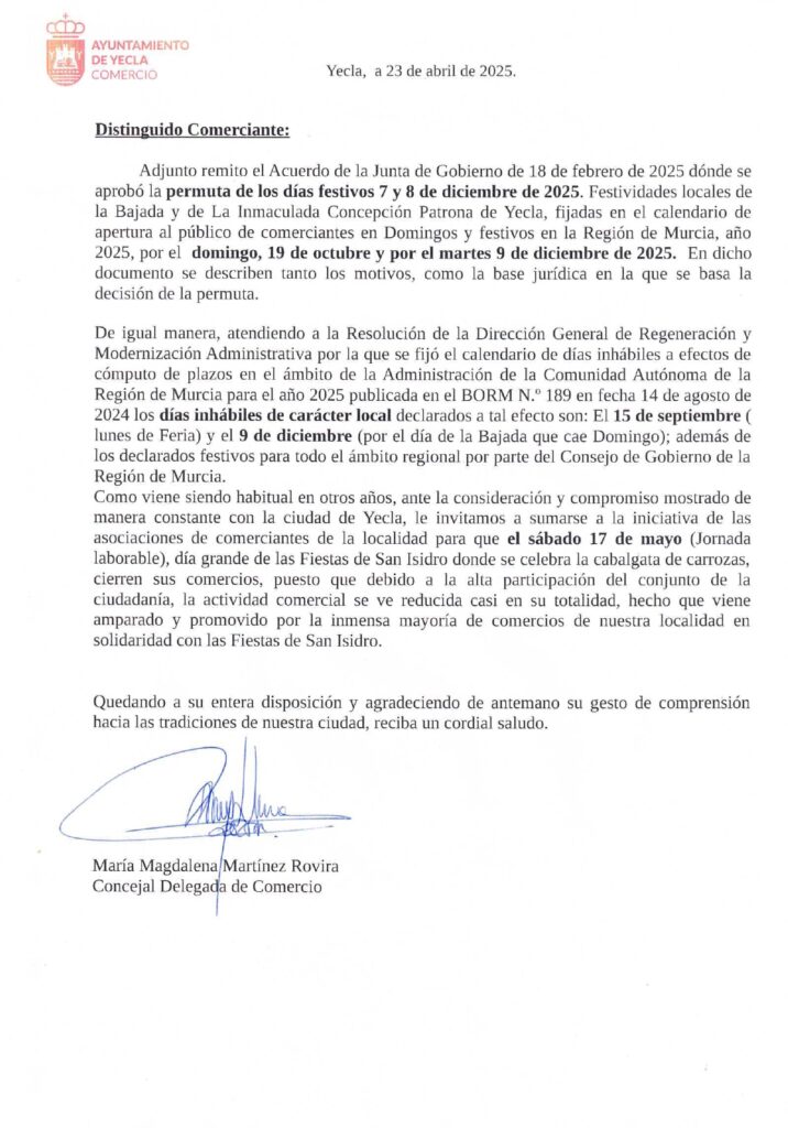 Por otra parte, se informa a todos los comercios que la Junta de Gobierno de 18 de febrero de 2025 aprobó la permutade los días festivos 7 y 8 de diciembre de 2025, festividades locales de la Bajada y de La Inmaculada Concepción Patrona de Yecla, fijadas en el calendario de apertura al público de comerciantes en domingos y festivos en la Región de Murcia, año 2025, por el domingo 19 de octubre y el martes 9 de diciembre de 2025.