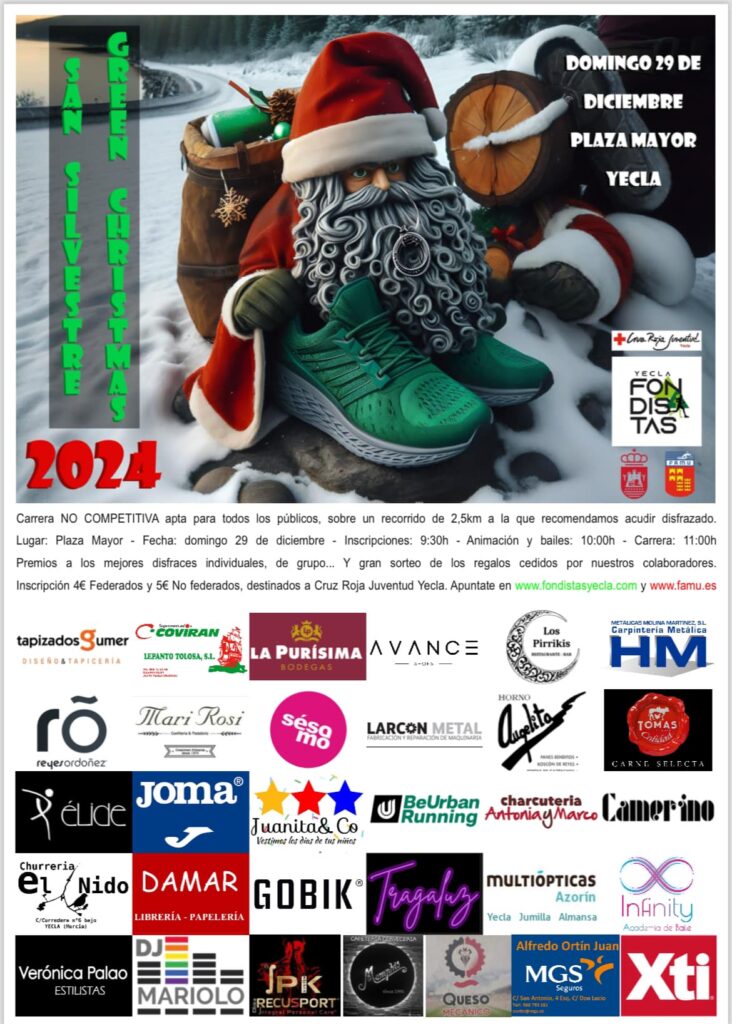 La XI edición de la carrera más divertida de Yecla, la San Silvestre Green Christmas, será este domingo 29 de diciembre, organizada un año más por el Club Fondistas y la Concejalía de Deportes, con la colaboración de la Federación de Atletismo de la Región de Murcia (FAMU) y Cruz Roja Yecla.