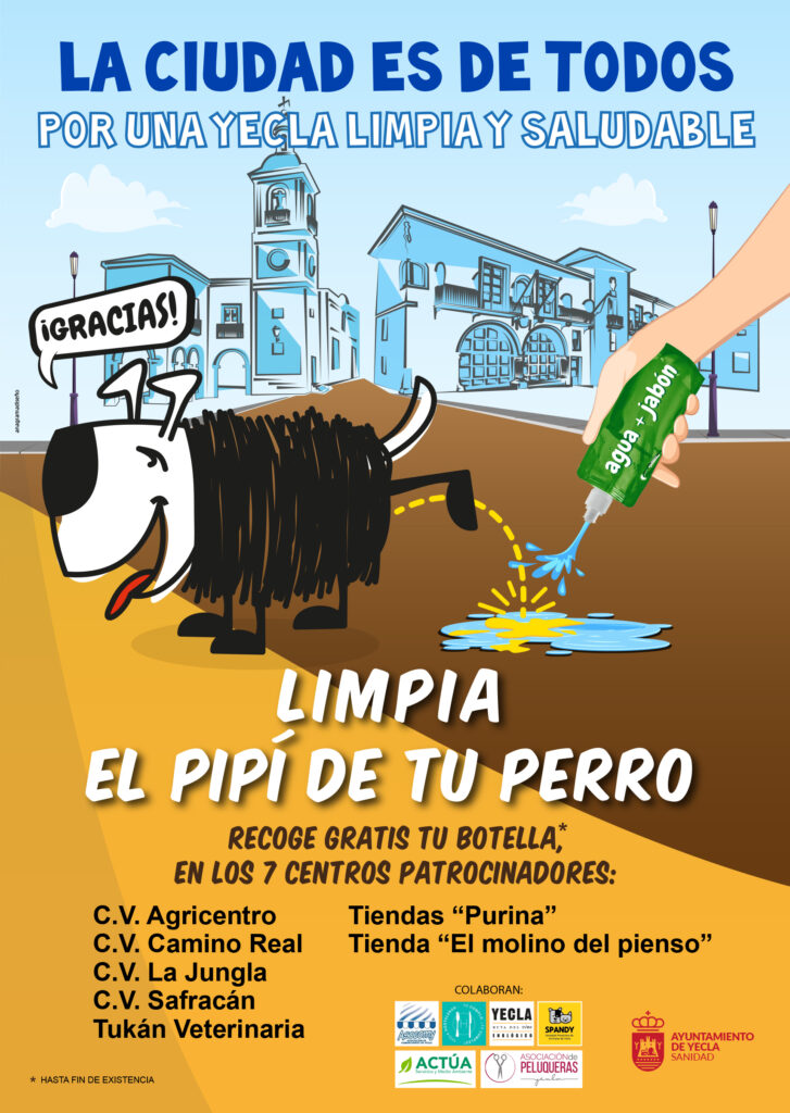 La Concejalía de Sanidad, a través del Servicio Municipal Veterinario, ha presentado la campaña “La ciudad es de todos, por una Yecla limpia y saludable: Limpia el pipí de tu perro”, cuyo objetivo es sensibilizar sobre la importancia de limpiar los orines de nuestros perros para mantener limpia nuestra ciudad, libre de olores y manchas en la vía pública. Los orines de los perros no solo estropean el mobiliario urbano, las farolas, papeleras y ensucian las fachadas de comercios, establecimientos, edificios públicos, etc., sino que generan molestias por sus malos olores y por ser fuente de infecciones y atracción de insectos.