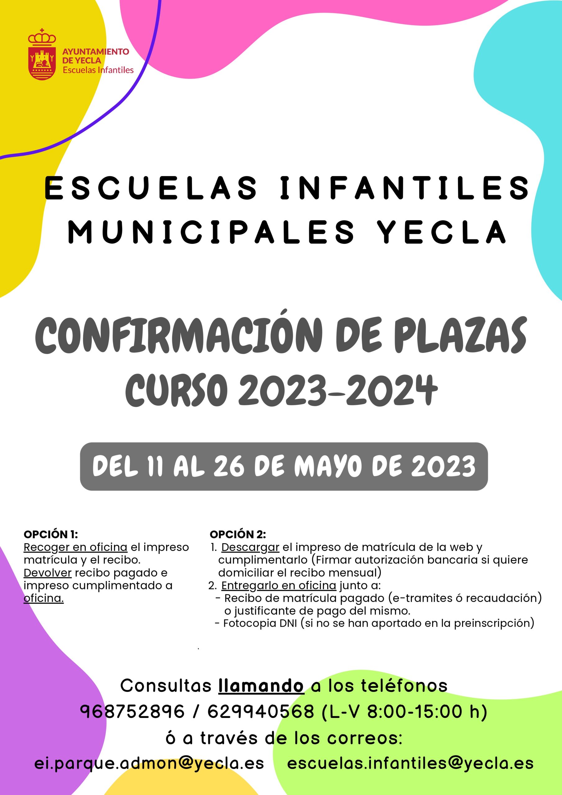 Si realiza transferencia tendrá que entregar el comprobante del pago en oficina o enviar la captura del pago a ei.parque.admon@yecla.es (indicando nombre del niño, escuela y año de nacimiento).