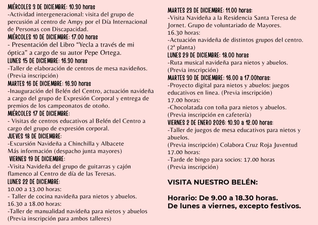 Par el miércoles, 17 de diciembre, se ha programado una serie de visitas a centros educativos al belén del centro, serán recibidos por parte del grupo de expresión corporal. El jueves, 18 de diciembre, los mayores de este centro viajarán a Chinchilla y Albacete y el viernes, 19 de diciembre, el grupo de guitarras y cajón flamenco realizarán una visita navideña al centro de día de las Teresas.