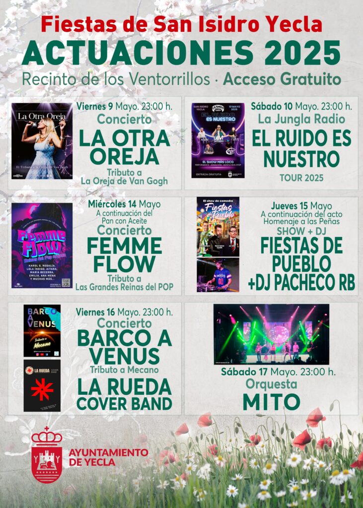 El amplio programa de actos se inicia el sábado 3 de mayo a las 20:00 horas en el Teatro “Concha Segura” con el acto de presentación de Reinas y Damas 2025 y pregón de las Fiestas de San Isidro 2025 a cargo de Pascual Juan Verdú.
