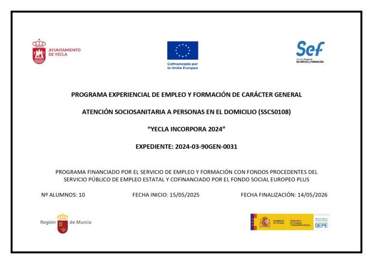 Selección y contratación en régimen de personal laboral temporal del personal, para el desarrollo del Programa Experiencial de empleo-formación «YECLA INCORPORA 2024″, dirigido a personas desempleadas en general, que contempla la modalidad de “Atención sociosanitaria a personas en el domicilio” nº expediente 2024-03-90GEN0031 » de 12 meses de duración, de: