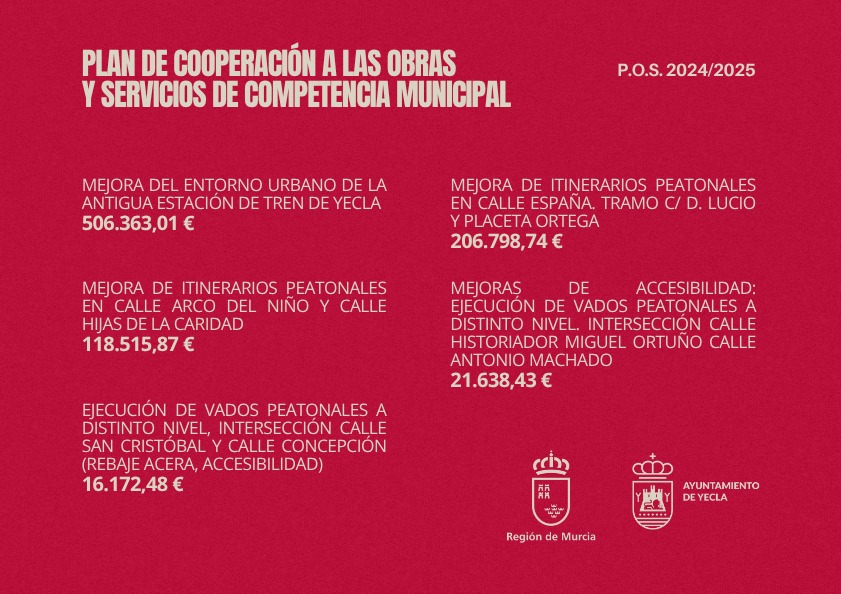 En su totalidad, el Gobierno Regional ha invertido en Yecla cerca de 900.000 euros en la reurbanización de la calle España, en el tramo entre calle Don Lucio y Placeta Ortega, así como en las calles Arco del Niño e Hijas de la Caridad. Esta inversión también incluye otras mejoras de la accesibilidad, a través de la ejecución de vados peatonales, a distinto nivel, en las intersecciones de las calle Historiador Miguel Ortuño y calle Antonio Machado y en la intersección de las calles San Cristóbal y Concepción.