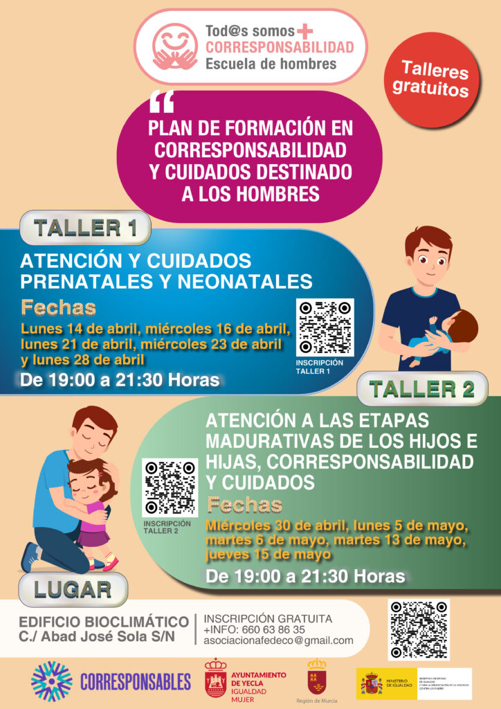 El segundo taller está dirigido a la atención en las diferentes etapas madurativas de los hijos e hijas, corresponsabilidad y cuidados. Se pretende conocer la manera de afrontar cada una de estas etapas de nuestros hijos. La concejala indicaba que este taller se ha realizado en años precedentes con muy buen resultado El taller se impartirá también por profesionales en el Edificio Bioclimático a partir del 30 de abril en un total de cinco sesiones, de 19:00 a 21:30 horas. La inscripción es gratuita y se puede realizar en el correo