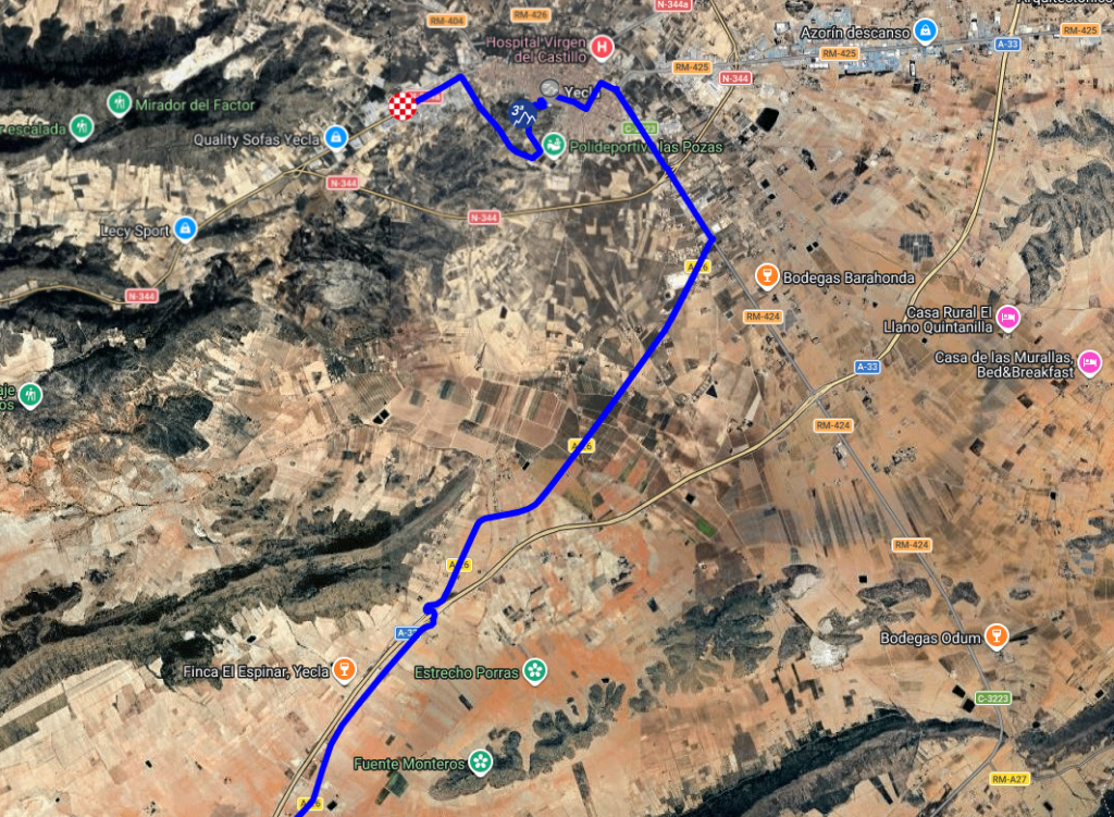 Está previsto que la carrera entre a Yecla pasadas las 15:00 horas por la carretera RM-424 y se dirija hasta la C-3223 para luego atravesar la Avenida de Cruz Roja. Seguidamente, transcurrirá por las calles Cura Ibáñez, San Fernando a Cruz de Piedra, Corredera a Plaza Mayor y Concejal Sebastián Pérez hasta el Santuario del Castillo. El descenso más espectacular se vivirá por la parte de atrás del Santuario del Castillo (Avenida Yeclano Ausente) y la Avenida de San Pablo, donde finalmente los corredores recorrerán la Avenida Adolfo Suárez dirección Gobik, lugar en el que estará situada la Meta.