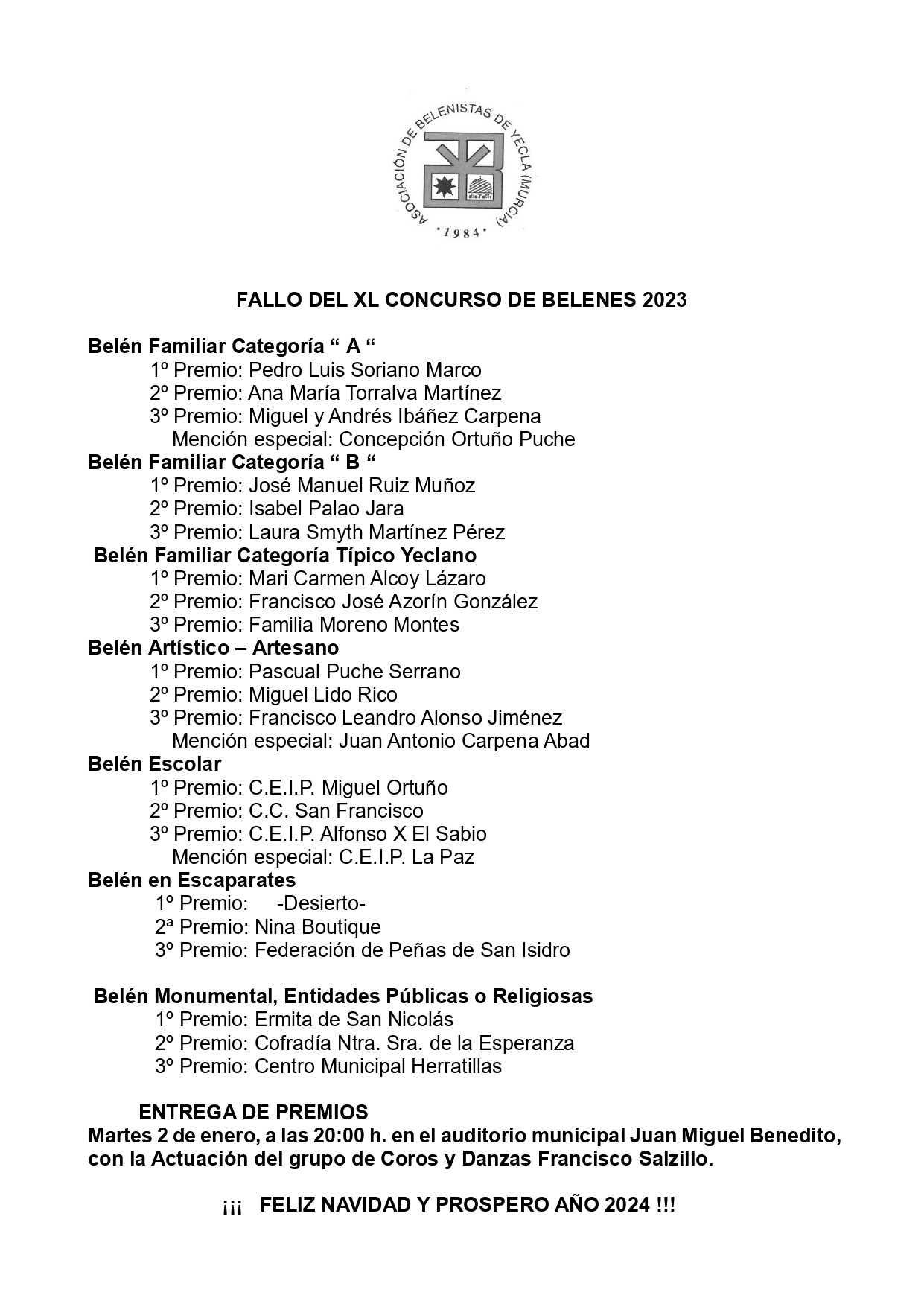 La entrega de premios tendrá lugar el martes 2 de enero, a las 20:00 h., en el auditorio municipal Juan Miguel Benedito, con la actuación del grupo de Coros y Danzas Francisco Salzillo.