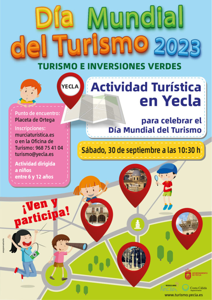 La actividad “Día Mundial del Turismo 2023”, tendrá lugar en la mañana de este próximo sábado 30 de septiembre, a partir de las 10.30 horas, en la Placeta Ortega. Las inscripciones se realizarán a través de la web murciaturistica.es, en la Oficina de Turismo a través del teléfono 968 75 41 04 o mediante el e-mail turismo@yecla.es